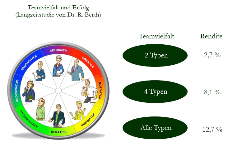 Je mehr unterschiedliche Typen von Menschen Sie in ihrem Team haben, desto höher wird die Effizienz bei der Teamarbeit sein. Dieser Erfolg ist dann nicht nur für das Unternehmen spürbar, sondern auch für die Teammitglieder.
